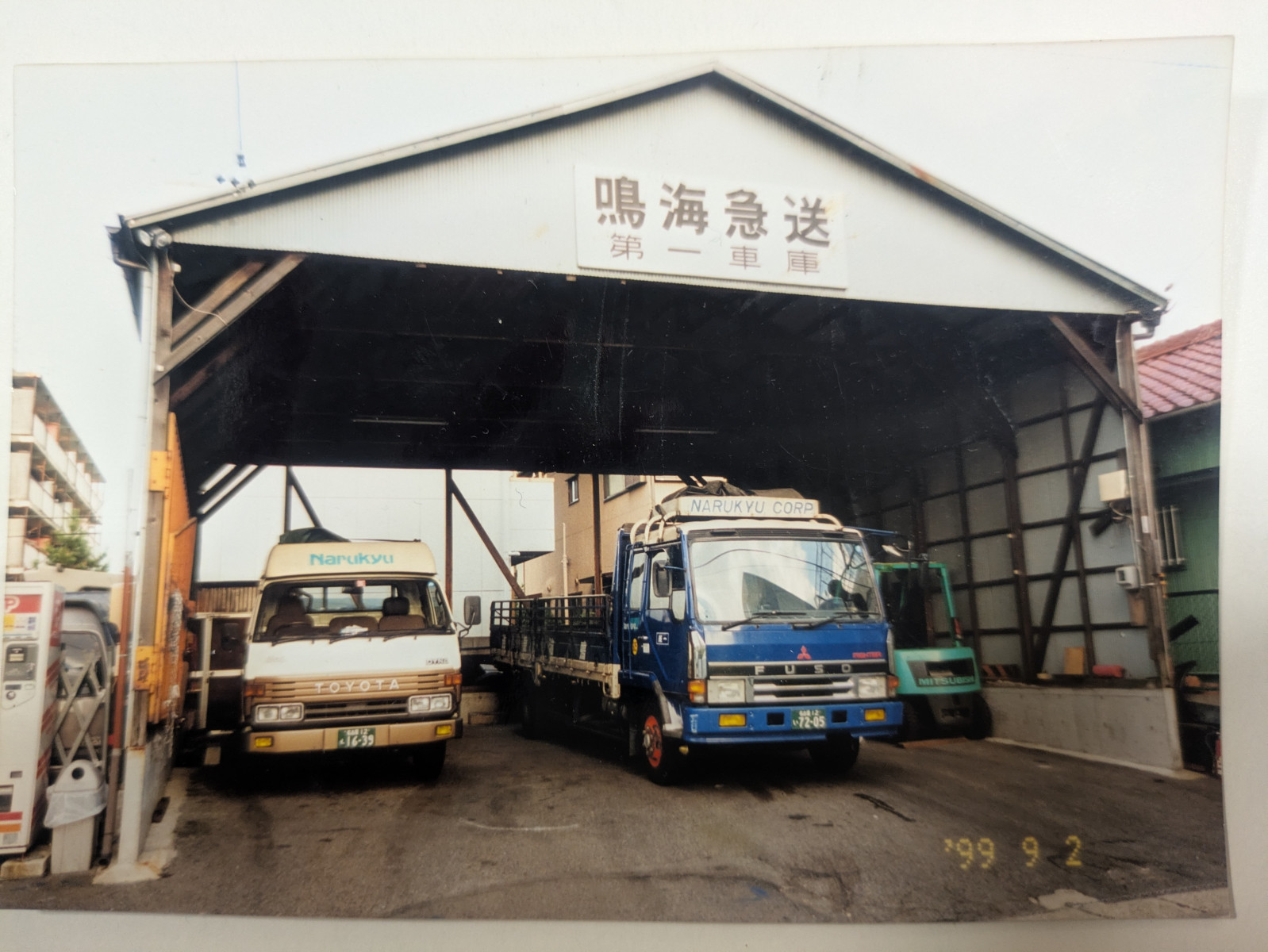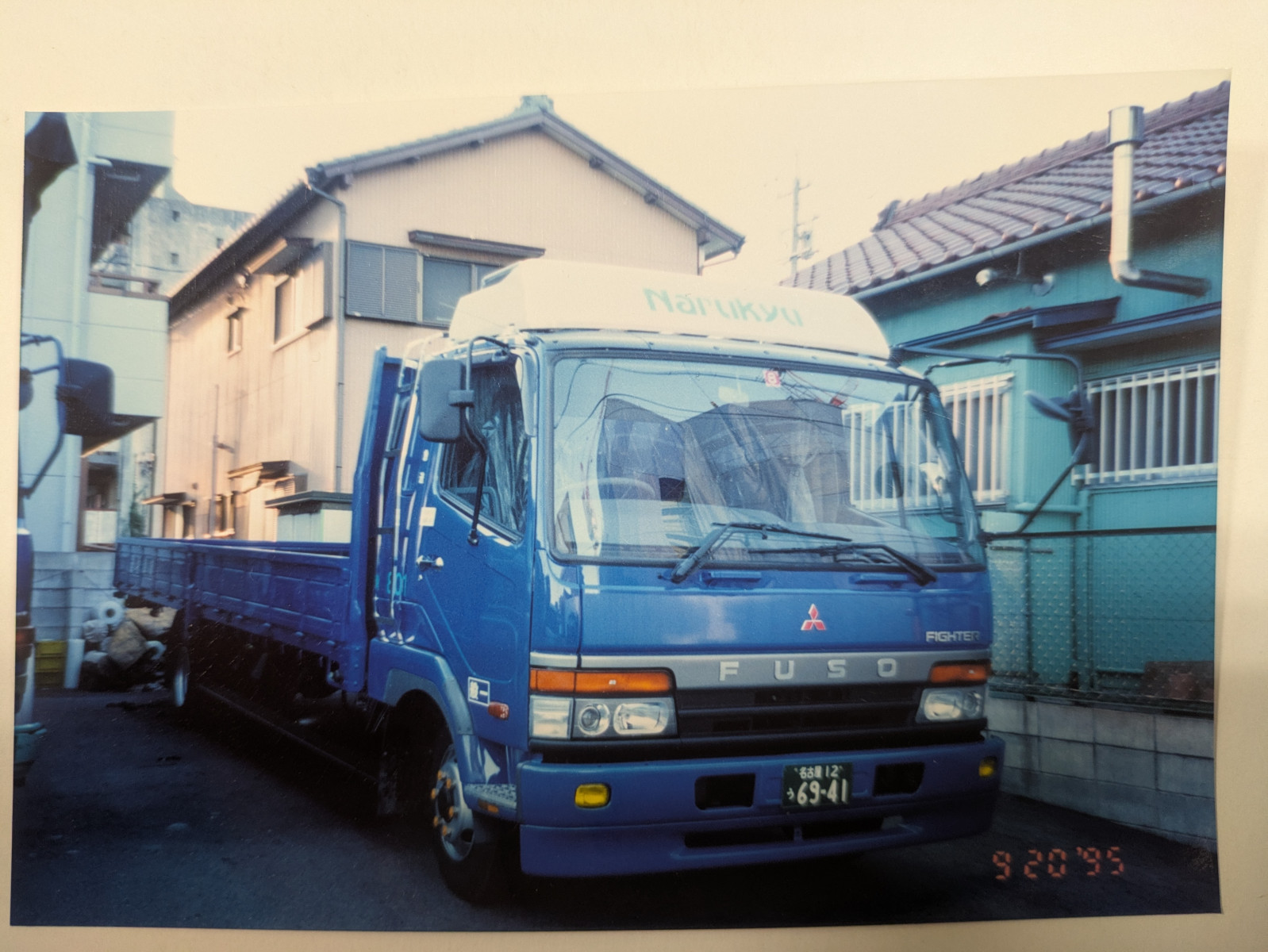 画像で遡るナルキュウの歴史① 2026/04/07 1995年9月20日 三菱ふそうから4トン平ボデーの801号車が納車 荷台の長さは7200㍉で特注車両でした。 積載は2650㎏ 同業他社と差別化する目的で導入しました。 たくさん積めましたが、過積載になることも多く、ドライバーの的確な判断が必要でした。 とにかく、シート掛けは大変な重労働でした。 そのため、途中から幌ウイング車両に改造されましたが、さらに積載重量は2000㎏までに。 最後は、当時のドライバーの過失によりトンネル手前のケタに激突。廃車となりました。